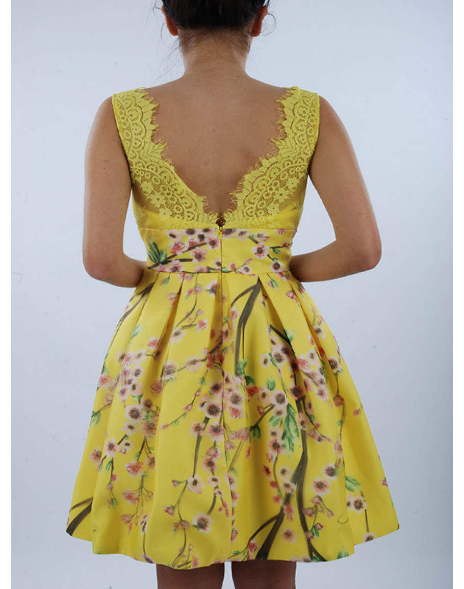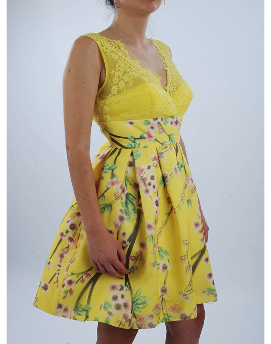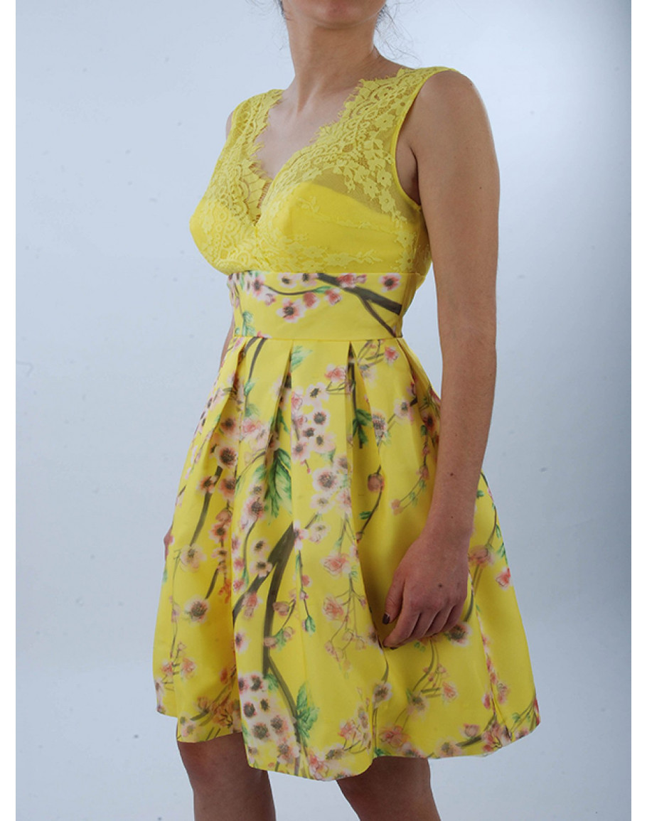 Κοντό φόρεμα με σχέδιο λουλούδια και δαντέλα στο πάνω μέρος.
